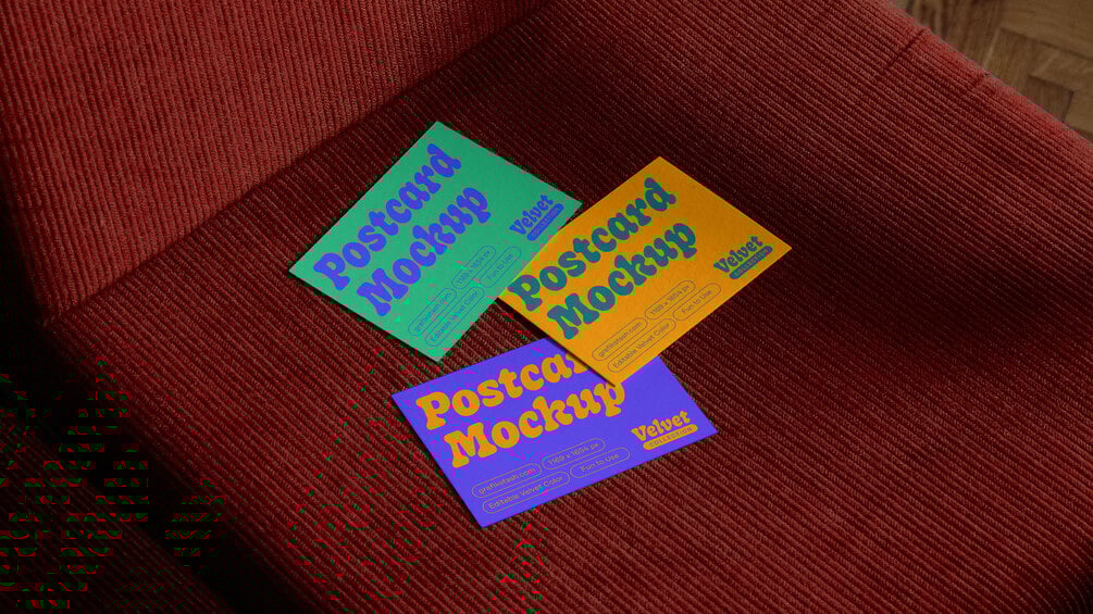 Premium A5 postcards mockup for showcasing your branding and illustration projects. The rich velvet textures will elevate any design portfolio and presentations, adding a touch of finesse to your work.