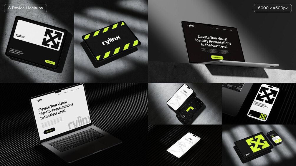 Rylinx collection is perfect for presenting your branding, web design or app design projects in a professional way. With a minimal and industrial look and feel, this collection will elevate your portfolio's aesthetic. The 6000 x 4500 px resolution will ensure safe cropping and crisp details in any format.