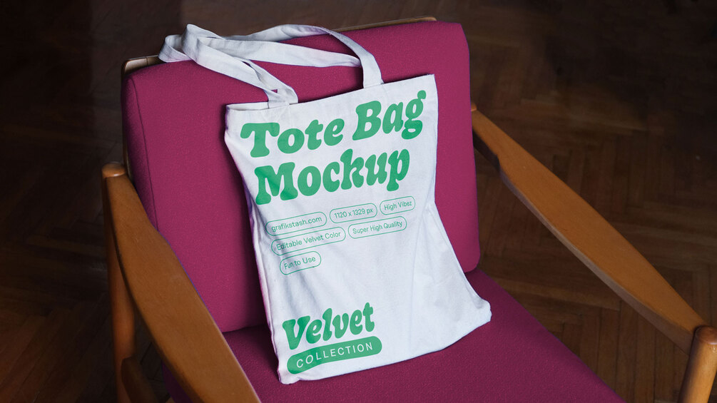Premium tote bag mockup for showcasing your branding and illustration projects. The rich velvet textures will elevate any design portfolio and presentations, adding a touch of finesse to your work.